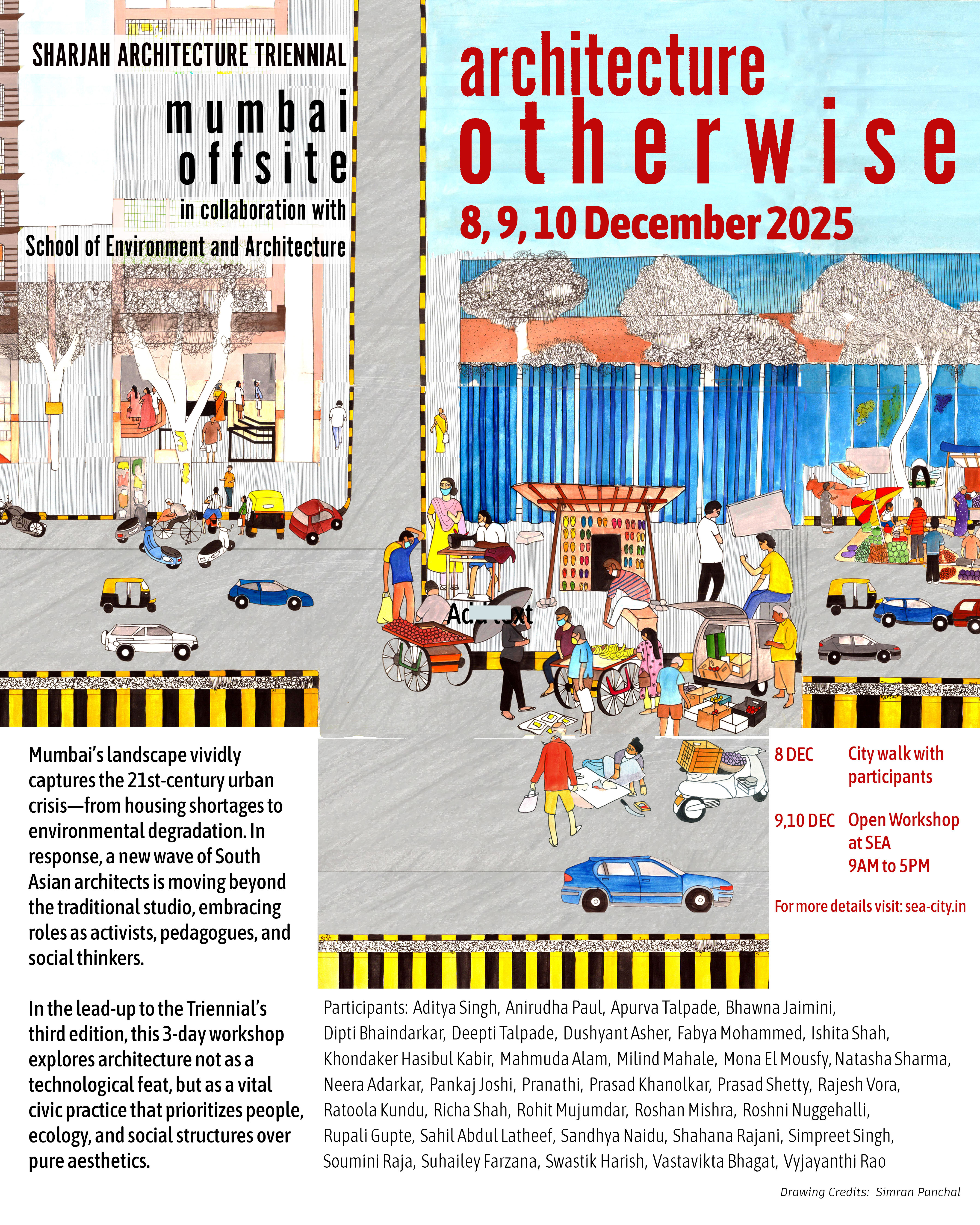 In this short three day workshop co-hosted by School of Environment and Architecture (SEA), Mumbai and the Sharjah Architecture Triennial in the lead up to the Triennial’s third edition, we hope to explore, celebrate and learn from the work of numerous innovative practices and institutions across South Asia. This conversation will be loosely framed around the themes of the third edition, titled Architecture Otherwise: Building Civic Infrastructure for Collective Futures. Our hope is to initiate a dialogue and an exchange between Sharjah and South Asia that will inform and be a part of the third edition’s attempt to revisit architecture as a civic practice rather than a technological one.
